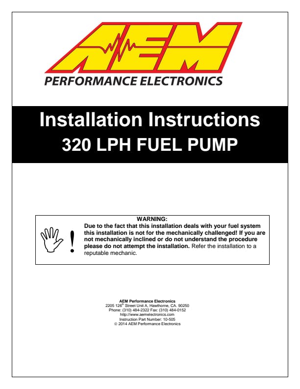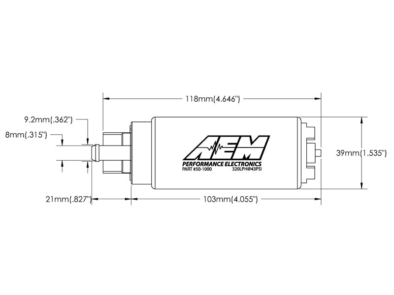 AEM's 340LPH High Flow In-Tank Fuel Pump is designed for high performance, naturally aspirated and forced induction EFI vehicles. It delivers reliable performance and a high volume of fuel flow for a very competitive price.The AEM 340LPH High Flow In-Tank Fuel Pump (PN 50-1000) flows 340 lph (84 gph) at 40 PSI and is capable of supporting over 1,000 HP at 43 PSI.* Please see the flow curves and current draw vs. fuel pressure graphs on the specs tab for more information.This fuel pump is designed for in-tank mounting for use with gasoline and features a compact 39mm diameter that fits most applications. It has an offset inlet design that eases installations and includes a wiring harness, pre filter, end cap and rubber buffer sleeve. Every pump is tested to flow 340 lph at 40 PSI before it is packaged for sale.AEM fuel pumps include a universal pre filter which may not fit certain vehicle applications. Please refer to the OEM recommendations for filter replacement for your vehicle.Your vehicle's factory fuel pump wiring may not be adequate enough to handle the current draw of AEM's High Flow Fuel Pumps. Please refer to the Electrical Requirements section in the instructions document for proper wiring.TECHNICAL SPECS:Weight: 12.5oz (354grams)Outside Diameter: 39mm ODExternal Materials: Black plated steel with laser etchingInlet Fitting: 7.7mm ID, 11.0mm OD. Offset InlineOutlet Fitting: 8 mm hose clamp. OffsetPRV Activation: 80 PSIImpeller Design: Single Scroll Ceramic TurbineVOLTAGE SPECS:Connector Terminal: 6 mm Spade (pos/neg)Min Voltage Input: 6 voltsMax Voltage Input: 18 voltsCurrent Draw (40 psi): 12 amps (13.5v)Current Draw (80 psi): 15 amps (13.5v)Fuse: 20 amps (13.5v)* Power rating given at 43 PSI, 13.5v at the pump terminal with a BSFC of .5. Flow capability for horsepower support is ultimately dependent on fuel hose diameter, and system electrical voltage and amperage capabilities.